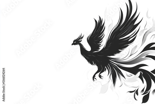 © Сергей Захаров, Obraz premium black-and-white vector of phoenix rising from flames with dynamic flowing feathers