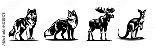 © NGX Studio, Obraz premium Black and white vector silhouette illustration of wolf, fox, moose, and kangaroo on a white background.