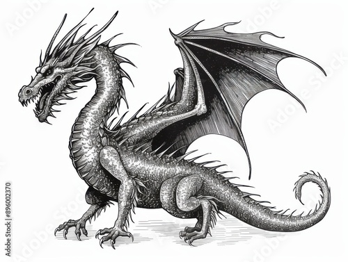 © Art Resources, Obraz premium Black and white Vintage engraved art of a dragon isolated on white background, ink sketch illustration, simple vector art design, highly detailed line art, high contrasty