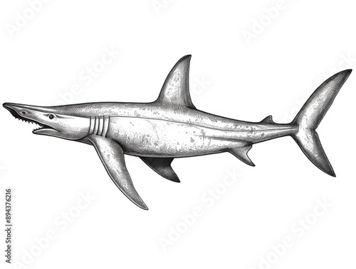 Naklejka premium Black and white Vintage engraved art of a hammerhead shark isolated on white background, ink sketch illustration, simple vector art design, highly detailed line art, high contrasty