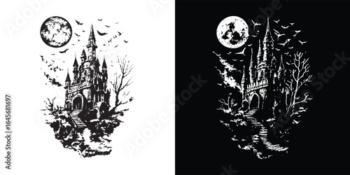 © Chairul, Naklejka premium Black and white vintage sketch of a spooky Halloween-style castle, featuring tall towers and gothic details, set against a contrasting background.