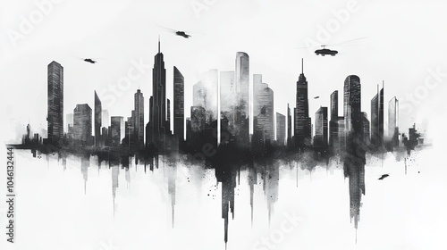 Naklejka premium Black and White Watercolor Cityscape with Flying Helicopters