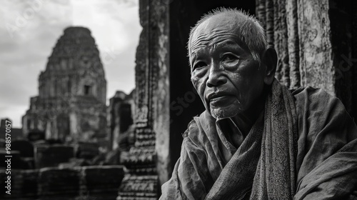 © aimodels24, Fototapeta premium Black and White Wide-Angle Shot of an Elderly Cambodian Man Wearing a Traditional Krama Scarf, Sitting Before Ancient Temple Ruins, Conveying History and Serenity