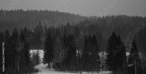 © Ксения Дубинина, Fototapeta premium Black and white winter landscape with high mountains