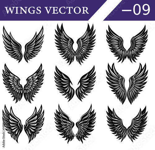 © stockmarket, Fototapeta premium Black Angel and Demon Feather Vector Set – Gothic Style Wing Silhouettes for Tattoos, Posters, and Fantasy Digital Illustration Use.