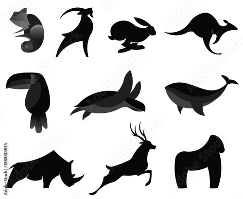 Obraz premium Black animal silhouette logo collection, minimalist wildlife vector icon set