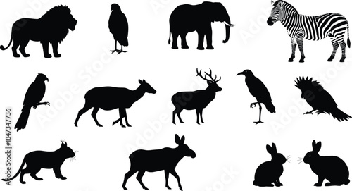 © Nur-Nobin Creations, Naklejka premium Black animal silhouettes including lion, elephant, zebra, deer, parrot, moose, rabbit, and wild cat, isolated on white background for wildlife concept.