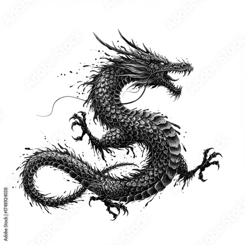 © AGUS, Obraz premium Black Asian Dragon Vector – Powerful Mythical Creature Illustration with Detailed Scales