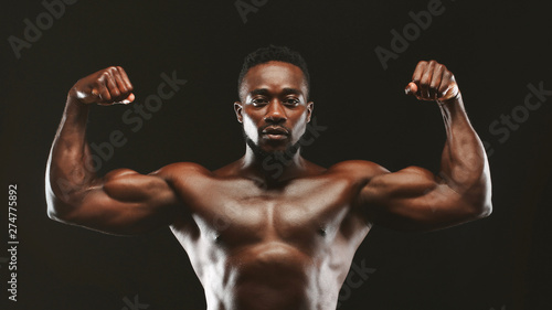 © Prostock-studio, Obraz premium Black athlete flexing muscles, demonstrating strong biceps