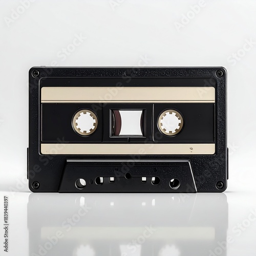 © Pure Imagination, Fototapeta premium Black Audio Cassette Tape with Gold Stripes on White Background Studio Lighting