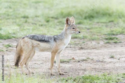 Fototapeta premium Black backed jackal (Canis mesomelas) standing on savanna, Masai Mara...