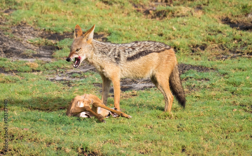 Fototapeta premium Black Backed Jackal (Silver backed Jackal) with a fresh impala kill, Chobe...