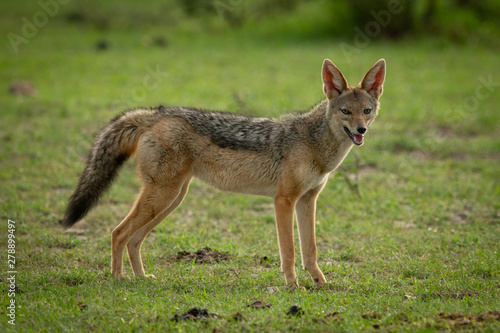 Naklejka premium Black-backed jackal stands in grass eyeing camera