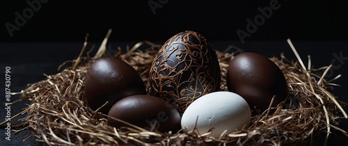 Fototapeta premium Black Background adorned with a chocolate easter egg in a nest and white...