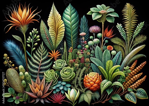 © Sandra, Fototapeta premium Black background botanical prints. Simple elegance.