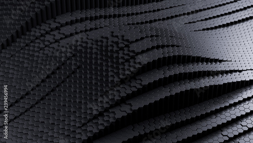 © samserius, Naklejka premium black background of hexagons of different heights, top lighting. Technological backdrop.3d Rendering.