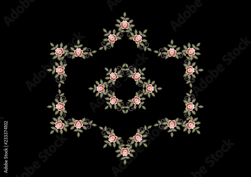 Fototapeta premium Black background with frame of embroidered pink roses with leaves and curls