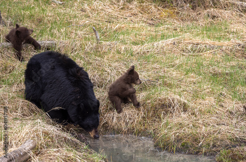 Fototapeta premium Black Bear Sow With Cubs in Springtime in Yellowstone National Park Wyoming