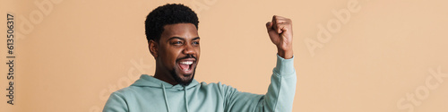 © Drobot Dean, Obraz premium Black bearded young man smiling and using cellphone