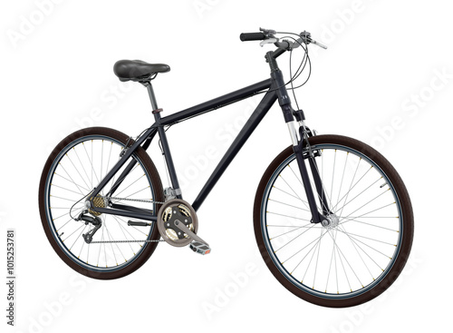 Obraz premium Black bicycle, side front view. Black leather saddle and handles. Png clipart isolated on transparent background