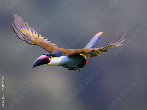 Naklejka premium Black-billed Mountain-Toucan Flying Through Tropical Cloud Forest Habitat