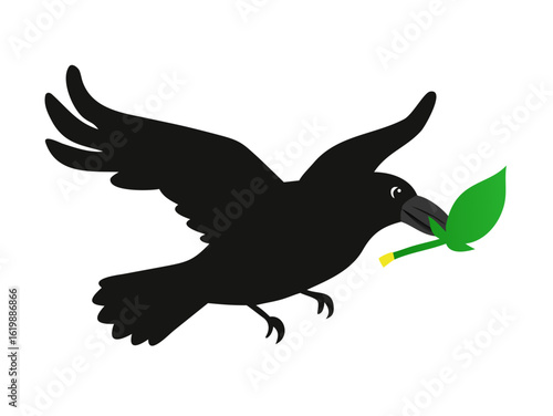 © VektorDesign, Fototapeta premium Black bird flying with green leaf in beak