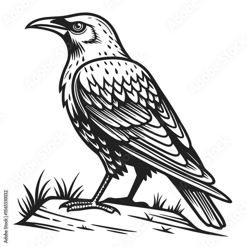© Akshay, Fototapeta premium Black bird perched on grassy ground black and white