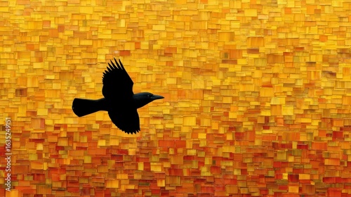 Naklejka premium Black bird silhouette flying against abstract golden and orange textured...