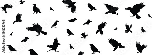 Obraz premium Black bird silhouettes collection featuring flying and perched crows, ravens,...