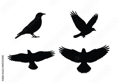 Obraz premium Black bird silhouettes collection, including crows and ravens, in various flying and perched poses, isolated on a white background