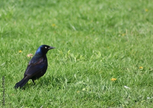 Fototapeta premium Black bird sitting in Green grass
