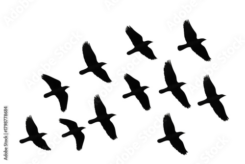 © PNG Kingdom , Fototapeta premium Black birds flock flying, freedom and migration concept, silhouetted against transparent background, open wings dynamics