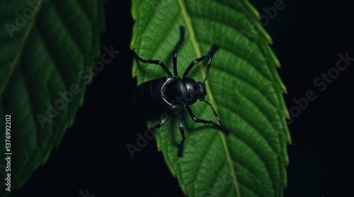 © Andi, Fototapeta premium Black Blister Beetle Resting on a Vibrant Green Leaf with Dark Background