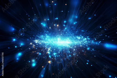 © Slepitssskaya, Fototapeta premium Black blue white tech futuristic background, light, abstract glowing rays, lines, dots. Generative AI