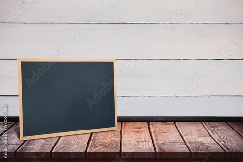 © vectorfusionart, Naklejka premium Black board on a wooden table