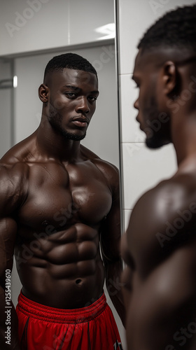 © kaliel, Fototapeta premium Black bodybuilder reflecting on fitness progress in bathroom mirror