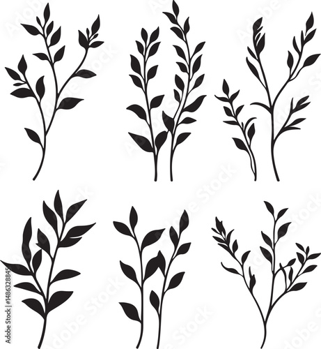 Fototapeta premium Black Botanical Leafy Branches Silhouette Vector Art