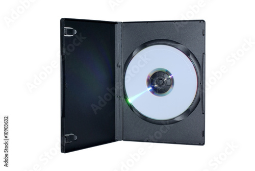 Obraz premium Black box with writable DVD disc inside isolated on white backgr