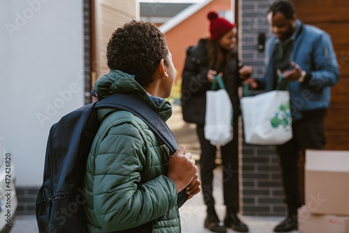 © Drobot Dean, Obraz premium Black boy standing on parking during moving with his family