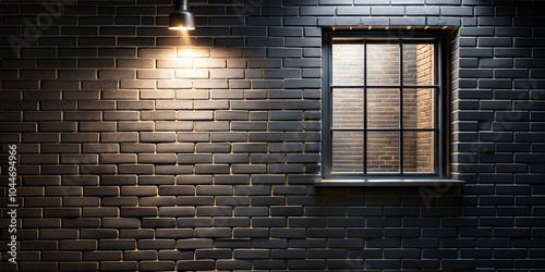 Fototapeta premium Black brick wall with window and illuminated light fixture