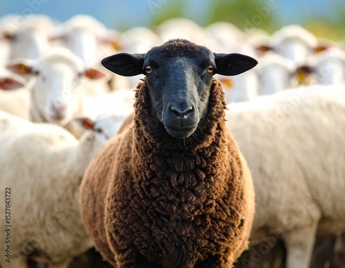 © Luthfi, Fototapeta premium Black-brown sheep amidst a flock
