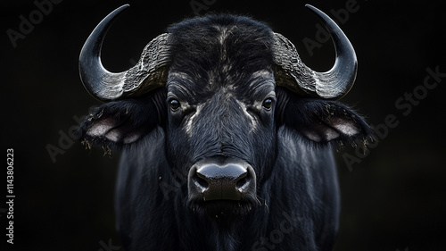 Naklejka premium Black buffalo, frontal view, powerful horns, dramatic contrast 32k, full ultra hd, high resolution