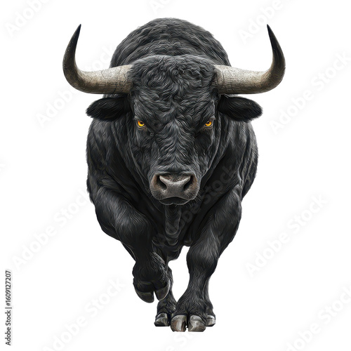 Naklejka premium Black bull charging forward in a powerful display of strength and presence in...