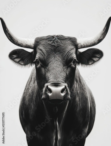 Naklejka premium Black bull portrait, farm animal, monochrome, intense gaze, wall art