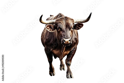 © Ranazain, Naklejka premium Black bull with large horns standing isolated on white background