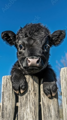 © Zidane, Fototapeta premium Black Calf Leaning on Fence Against Blue Sky