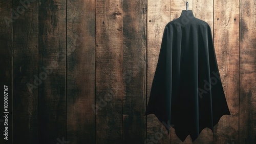 © Artyom, Naklejka premium Black cape hanging on wooden wall