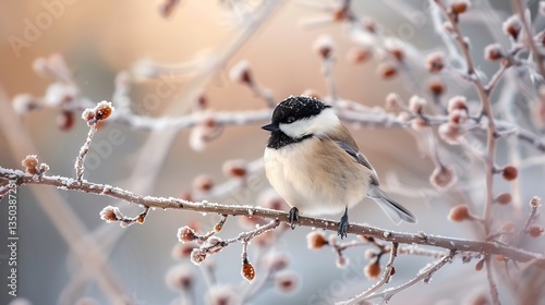 © EpochXstudio, Naklejka premium Black capped chickadee perched a delicate tree branch soft blurred background detailed tiny feathers realistic winter scenery crisp depth of field