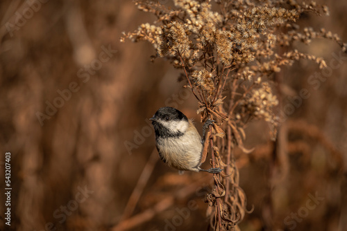 © Judy, Fototapeta premium Black-capped Chickadee perched on a plant stem