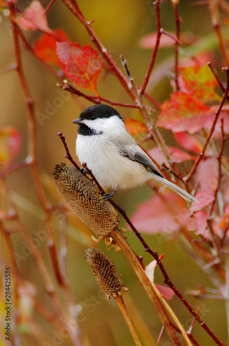 Fototapeta premium Black-capped Chickadee, Poecile atricapilla, adult eating flower seeds, Grand Teton NP,Wyoming, September